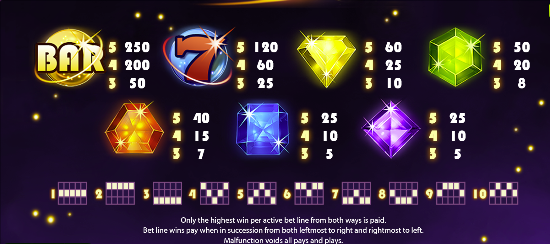 Payline Configuration10 fixed paylines (wins both ways)